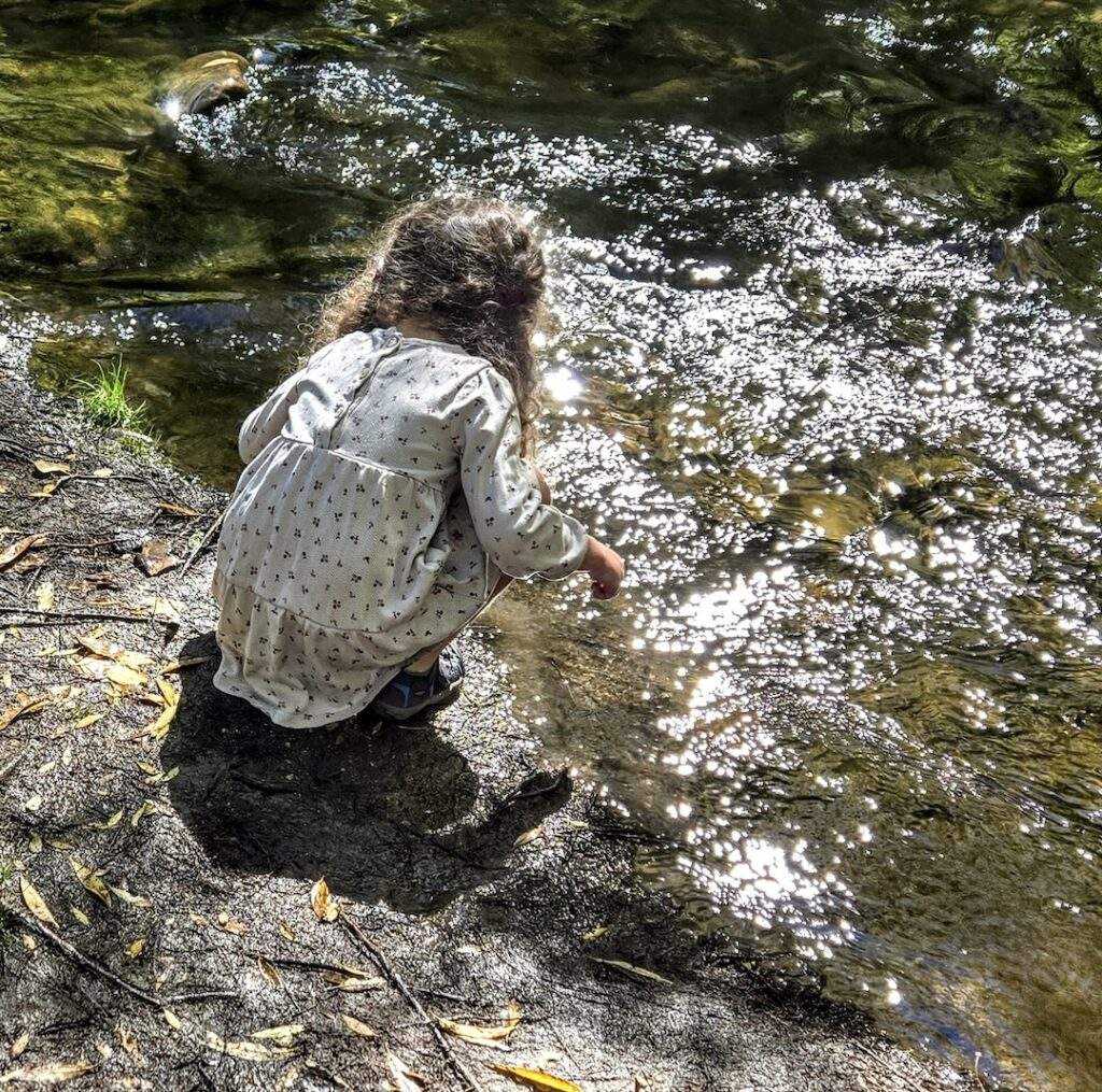 After coming together for a group conversation, the children got up and started moving through the forest, each following whatever caught their attention. One girl crouched by the edge of the creek with a net and started skimming the water for insects. Two boys found a log that rocked like a teeter-totter. They stood on opposite ends of the log, trying to find balance. One child tucked herself into the crook of a tree’s roots, tracing the edge of a small plant with her fingers. Nearby, a group of boys took large sticks and slapped them on the surface of the water, just to hear the sound it made.